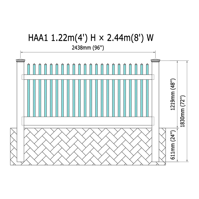 | পিকেট | 1 1/2 "x 1 1/2" x 39 '' x 22 পিসি (স্ট্যান্ডার্ড স্পেসিং) |