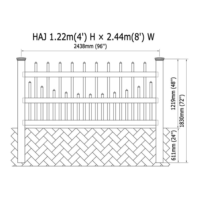 | পিকেট | 1 1/2 "x 1 1/2" x 40 '' x 21 পিসি (স্ট্যান্ডার্ড স্পেসিং) |