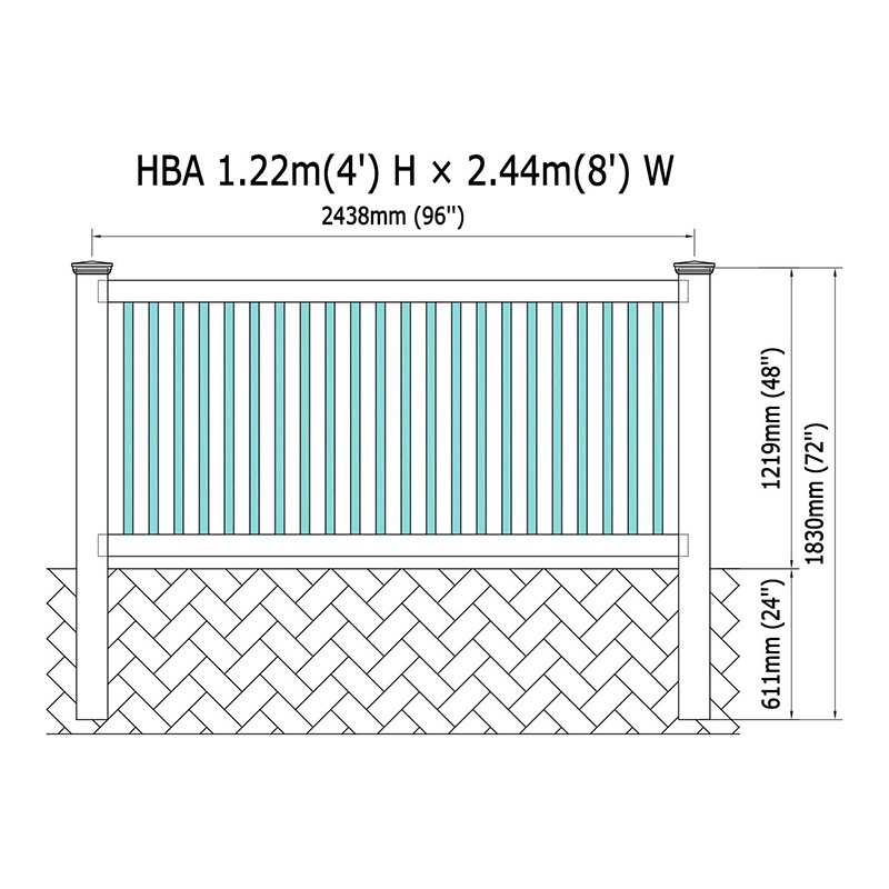স্ট্যান্ডার্ড উচ্চতা 48 ইঞ্চি এবং প্রস্থ 96 ইঞ্চি, বিভিন্ন বিকল্প উপলব্ধ। পোস্টগুলি 4 "x 4" বা 5 "x 5" এ আসে, সহজ ইনস্টলেশনের জন্য প্রাক-রুট করা।
