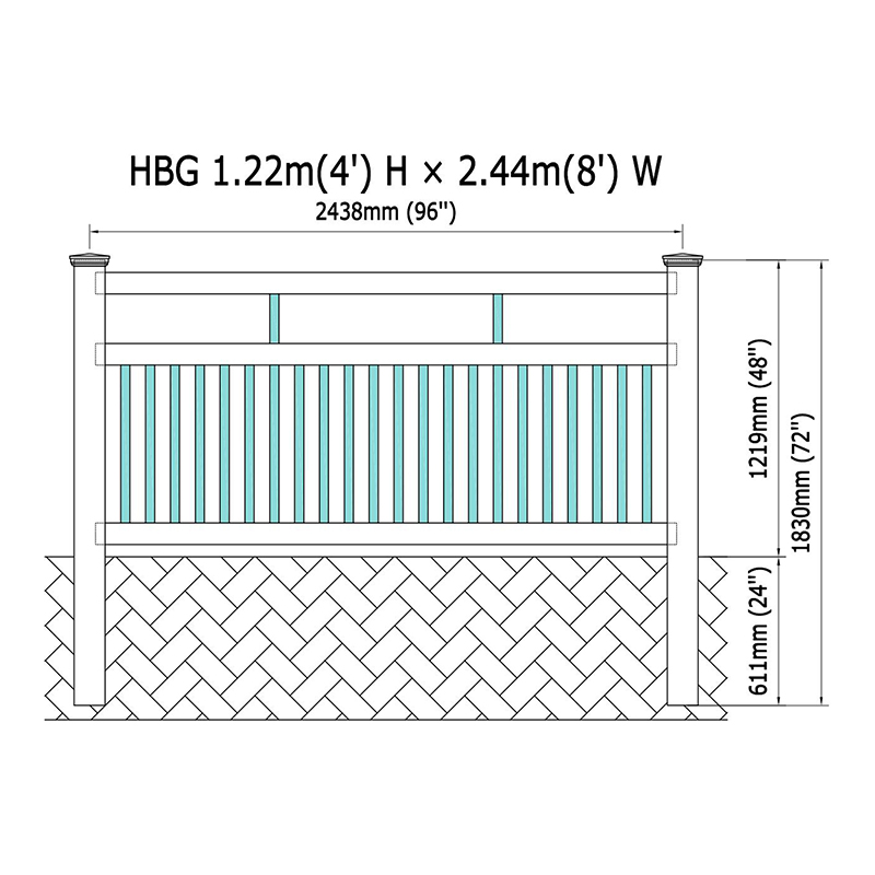 | পিকেট | 1 1/2 "x 1 1/2" x 40 '' এক্স 2 পিসি; 1 1/2 "x 1 1/2" x 30 '' x 20 পিসি (স্ট্যান্ডার্ড স্পেসিং) |